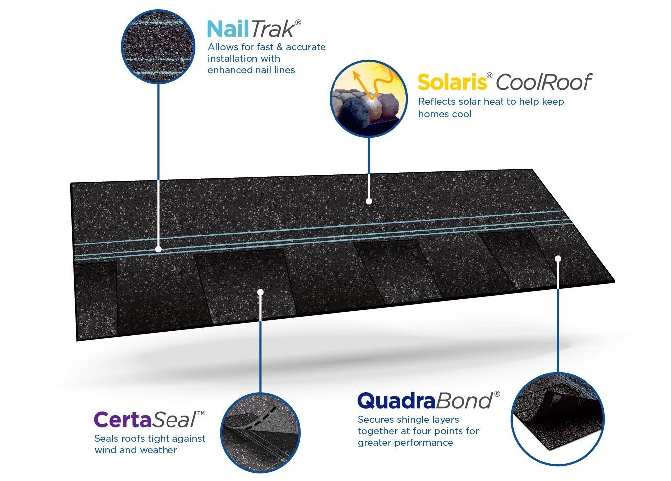 - Quadra Bond technology to firmly secure the layers of each shingle together, helping roofs stand up to wind and weather.